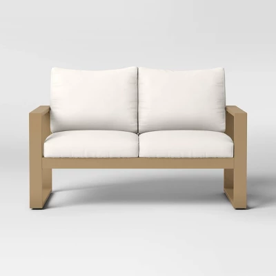 Enjoy relaxing moments with a loved one by sitting on the Esker Outdoor Patio Loveseat from Threshold™. Designed with a wooden frame, this outdoor loveseat features neutral-shade upholstery to complement a variety of porch or patio decor. It boasts a weather-resistant design to help you enjoy all the seasons outdoors in comfort, and you can add a coordinating slatted table to create a perfect sitting arrangement for two or pair it with extra seats to accommodate other family members or guests.