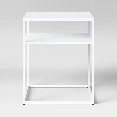 Add sleek, modern style to your space with this Glasgow Metal End Table from Threshold™. Crafted from metal in a solid hue, this end table sports a clean silhouette and a rectangular tabletop for a sleek look that instantly elevates any setting in your home. The end table features a spacious tabletop to display your favorite decor, along with a lower shelf to provide additional storage space you’ll appreciate. Place it next to your sofa in your living room or alongside your chair to rest your book, cup of tea, small potted plant or a lamp.