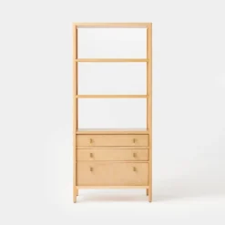 Anchor your space with the modern elegance of the Quail Hill 3-Drawer Nightstand from Threshold™ designed with Studio McGee. Featuring a wooden frame for sturdy support and style, this rectangular nightstand in blue with a painted finish adds a pop of serene color, and offers a generous display surface with its smooth tabletop. The stack of three drawers underneath offers plenty of hidden storage space to keep your go-to essentials within easy reach. The stubby angled legs and gold-tone pulls with crescent cutouts add eye-catching flair and functional style with a glam shine. Place it next to your bed to display decor and keep frequently used nighttime essentials.