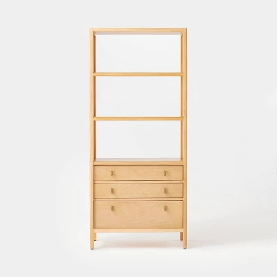 The Sandpoint Bookcase with Drawers from Threshold™ designed with Studio McGee blends style and function to upgrade any space in your home. Made from MDF with a wood frame in a natural hue, this bookcase pairs easily with a variety of other decor. It’s designed with three open-back shelves plus three drawers with brass-finish pull knobs, giving you plenty of space for storage and display, and the anti-tip anchoring hardware gives you some extra peace of mind.