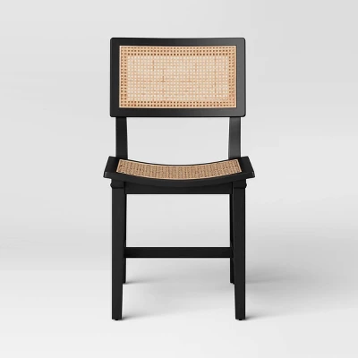 Add timeless elegance to your dining decor with the Tormod Backed Cane Dining Chair from Threshold™. The armless dining chair has a rectangular seat and back with a woven cane design and a contrasting black wooden frame to add depth and refinement to your decor. It stands on four angled legs with side stretchers and a horizontal bar and can also be used for additional impromptu seating anywhere in your home.